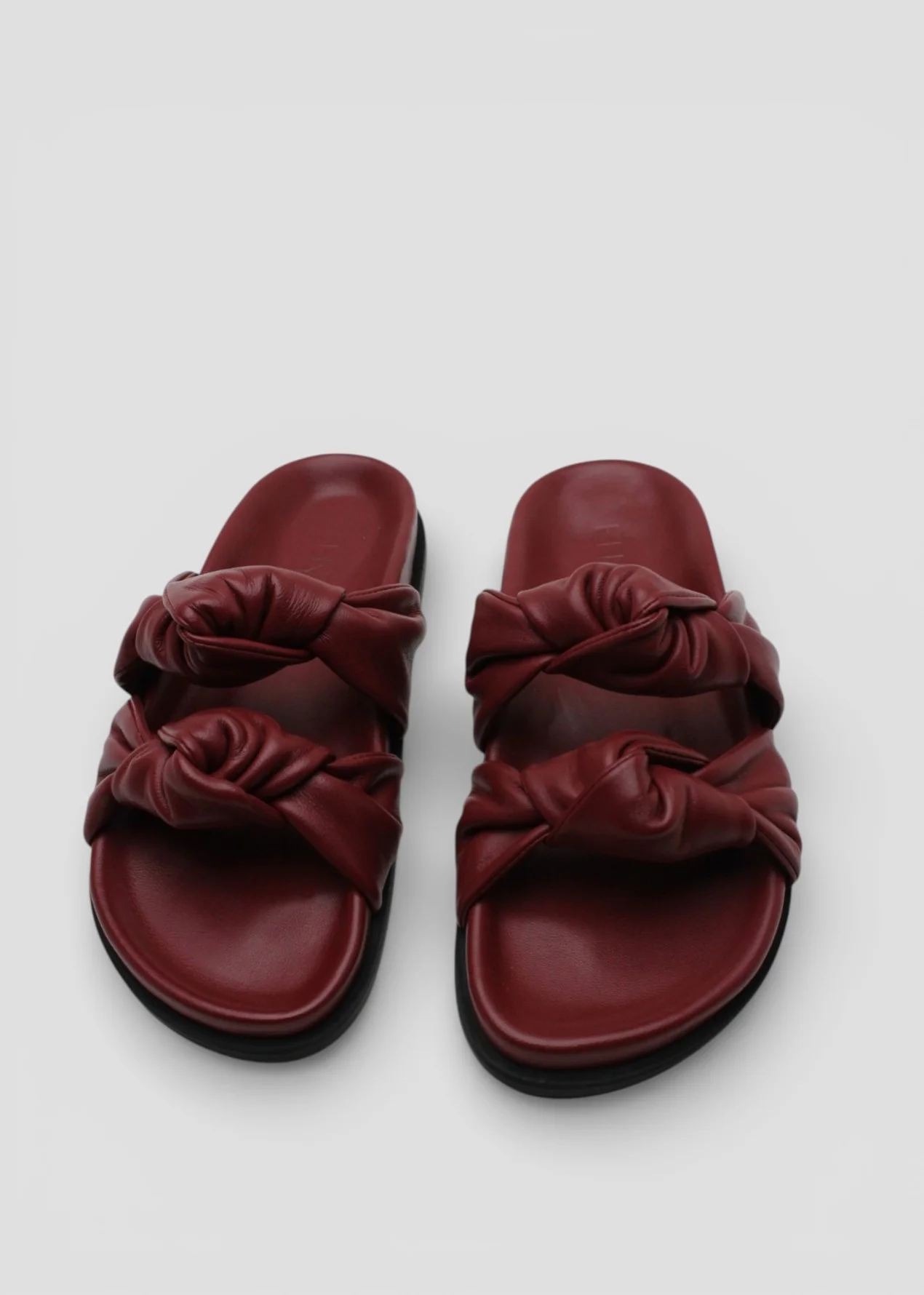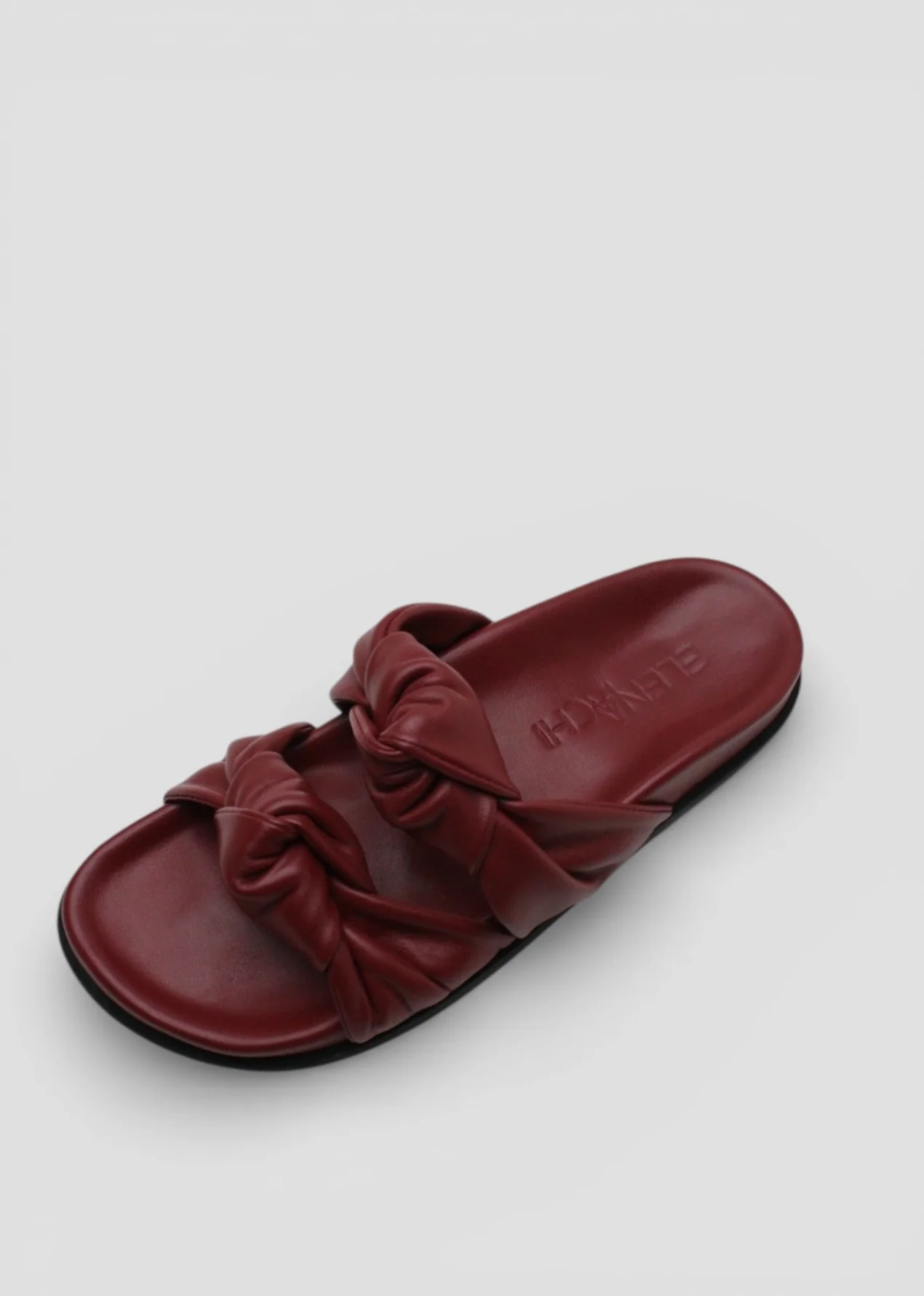 Elegante ciabatta in pelle color bordeaux, caratterizzata da fasce intrecciate che avvolgono il piede con stile e comfort. La suola in gomma garantisce stabilità e praticità in ogni passo.
