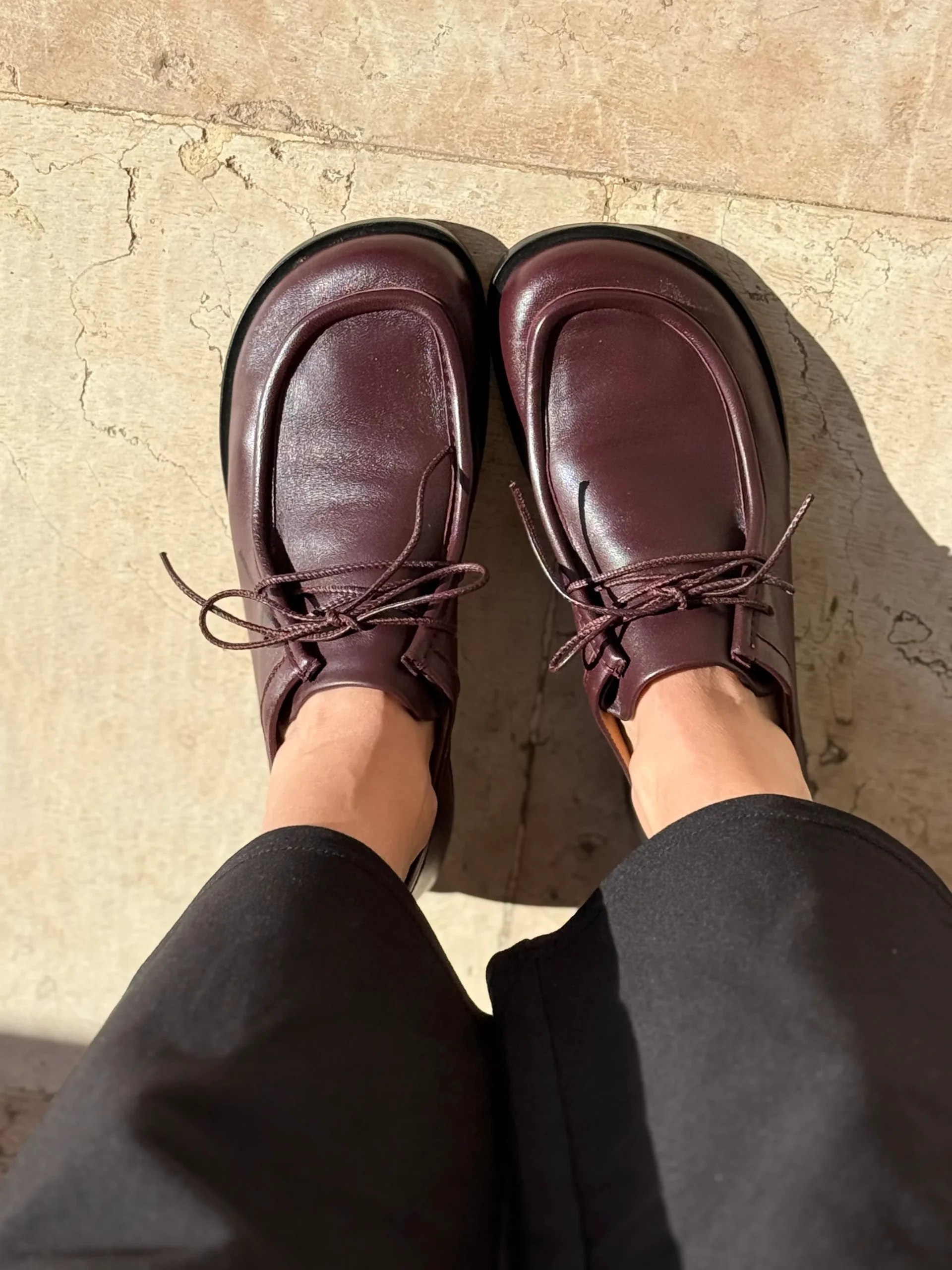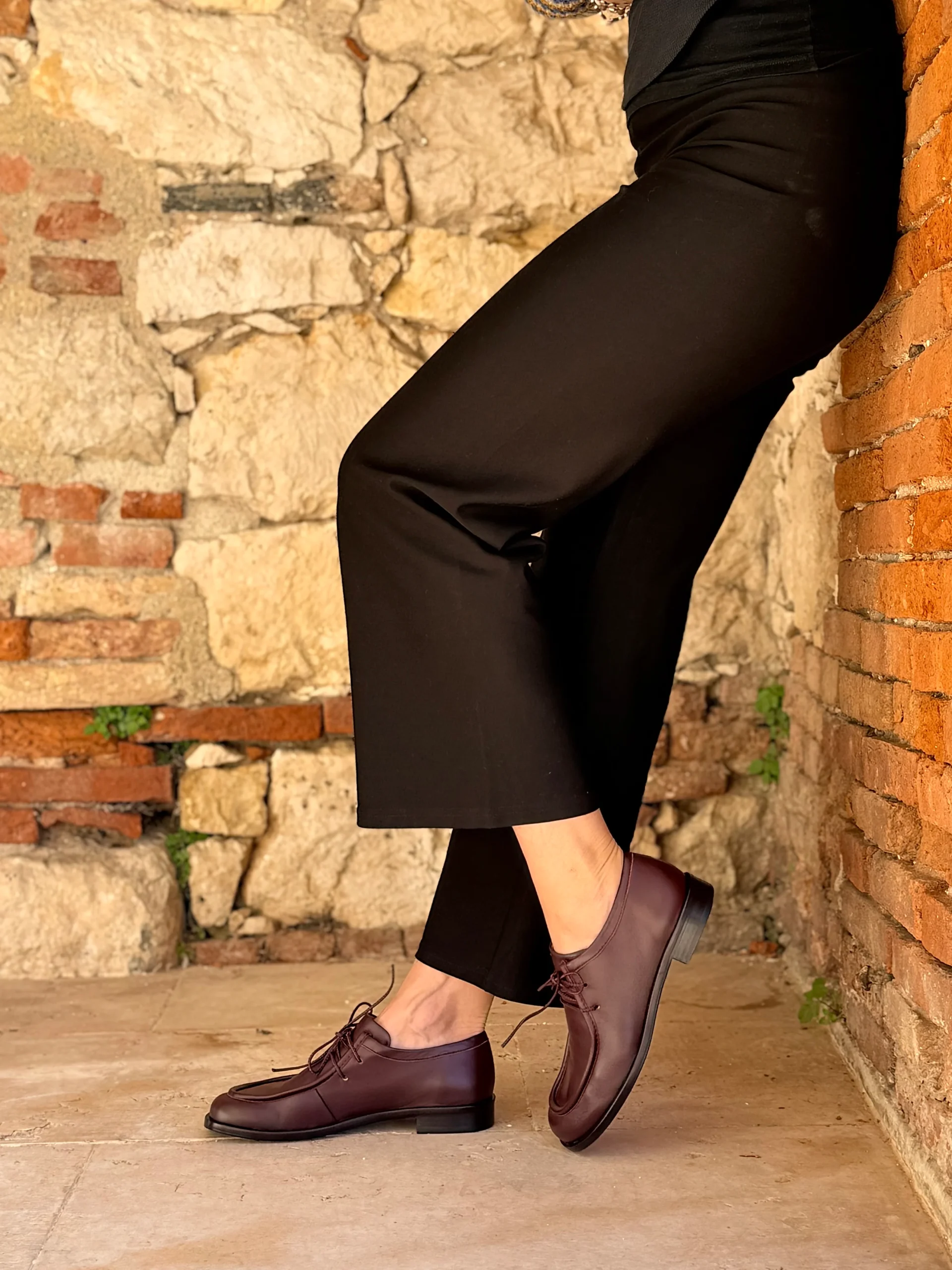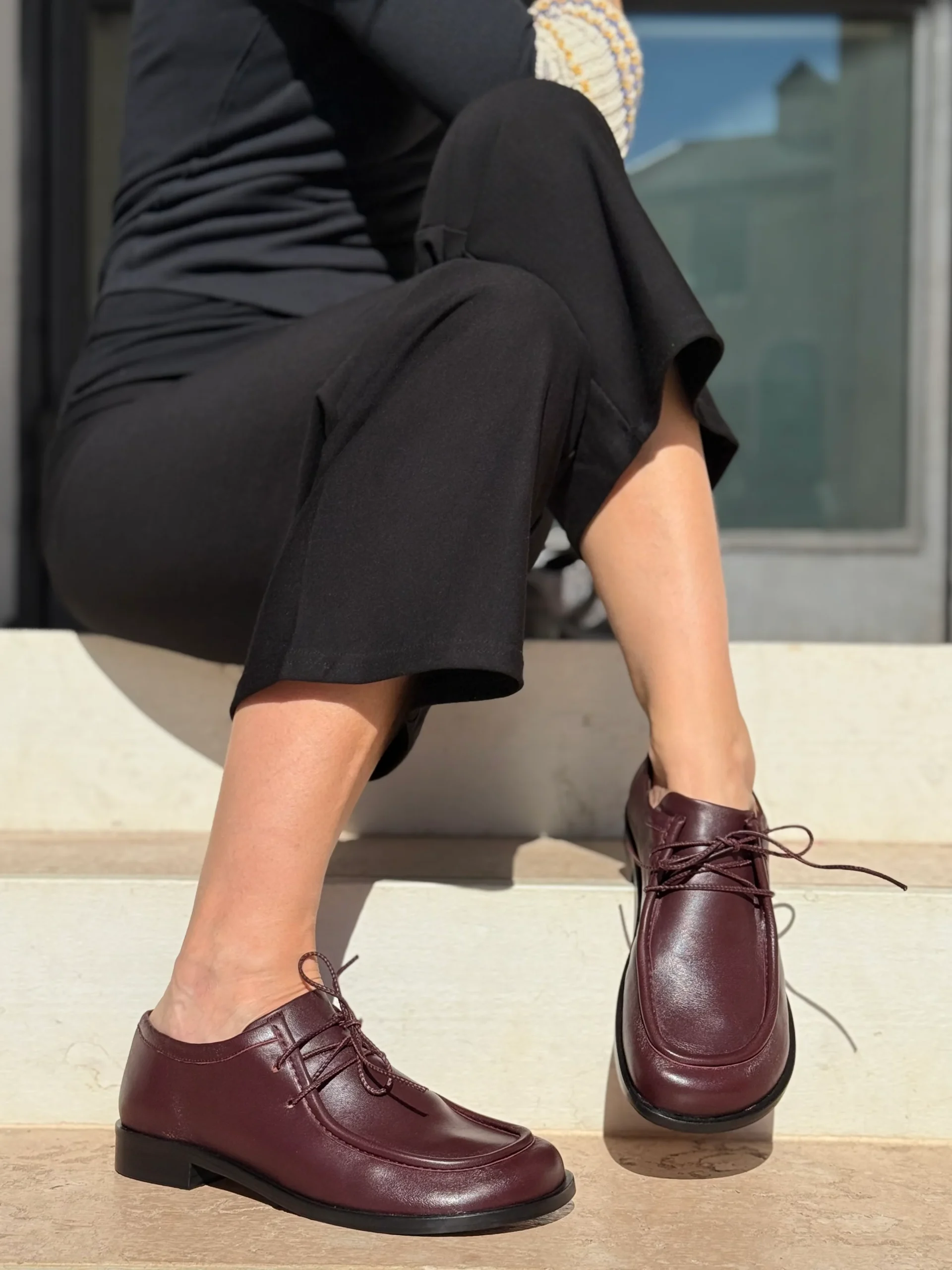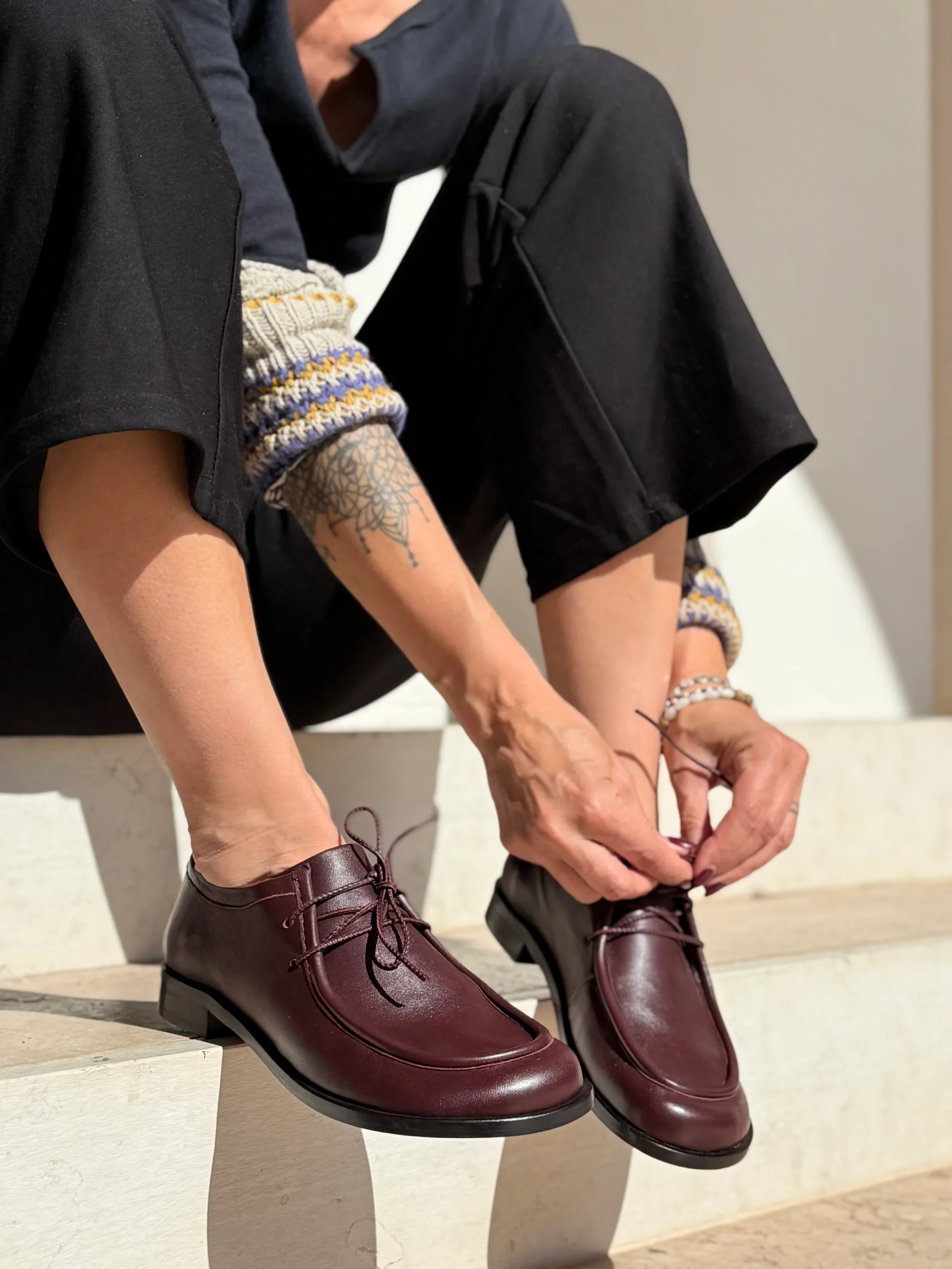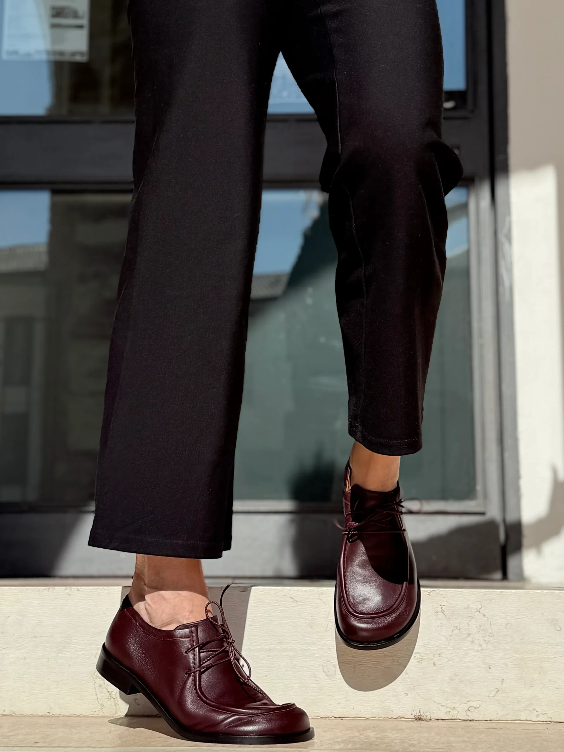 Tenebra Wine modello “ingegnere” in morbida nappa bordeaux, caratterizzato da linee decise e dalla bordatura tono su tono che ne esalta la pulizia formale.