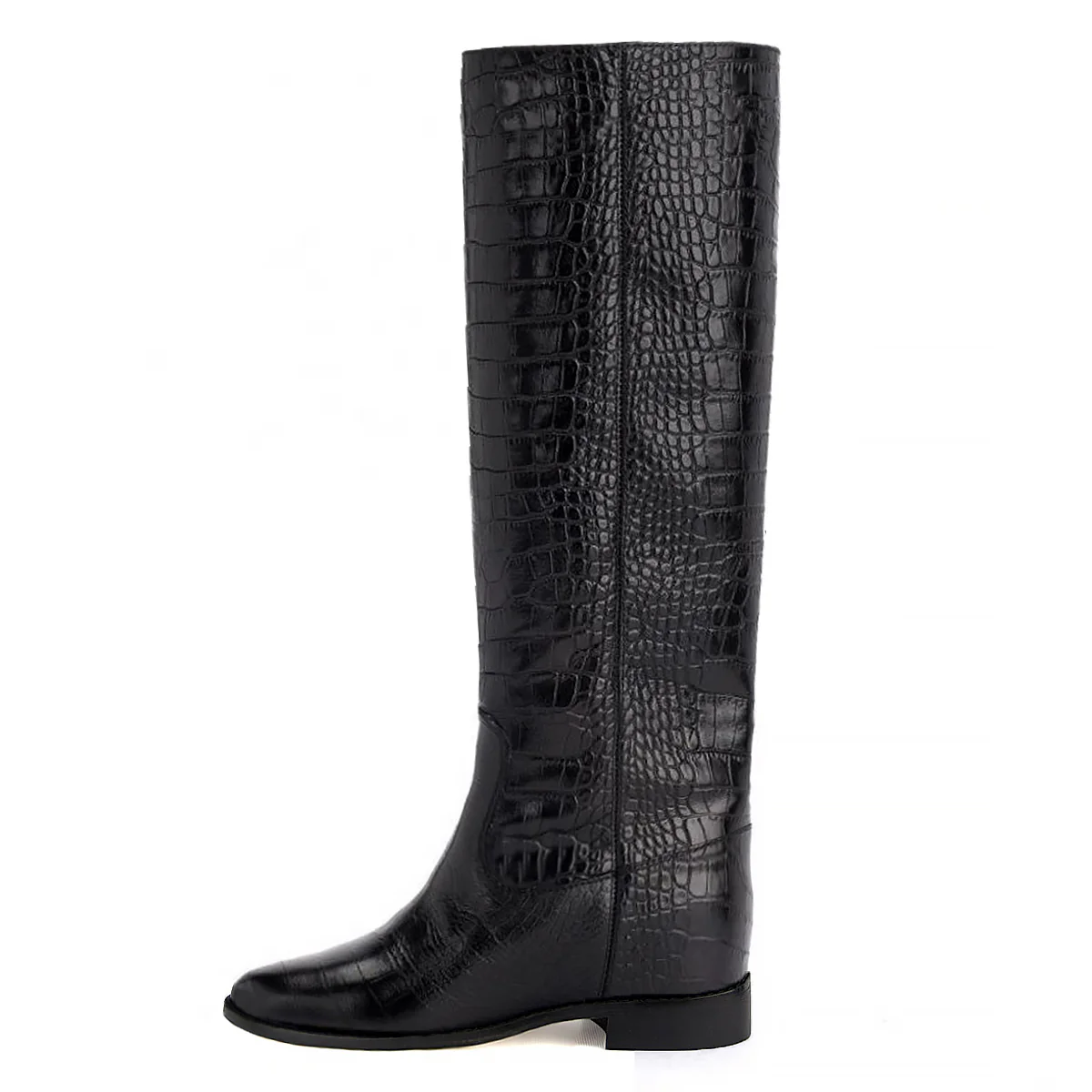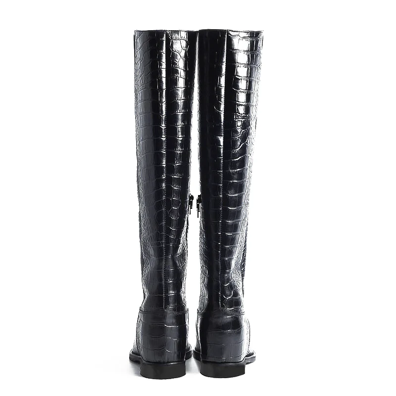 Il classico modello da cavallerizza incontra il lusso della stampa di coccodrillo. L’ulteriore segreto? La zeppa interna che permette di indossarli comodamente tutto il giorno, ma vincendo quasi 7 cm di altezza. Sono così versatili che saranno perfetti per essere indossati in modo informale in ufficio, ma saranno anche un accessorio di carattere da sfoggiare per le serate con gli amici. Il giusto tocco di eleganza per un look tutt’altro che scontato.