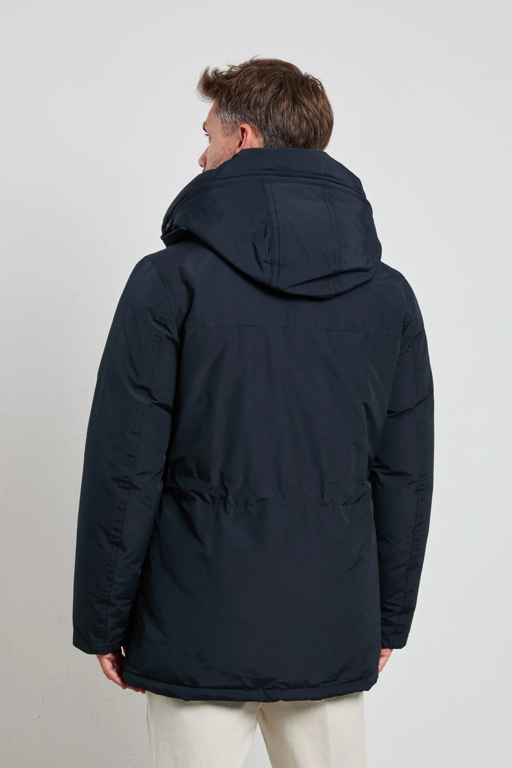 Composizione: 60% cotone, 40% fibre tecniche; imbottitura 90% piuma, 10% piumino