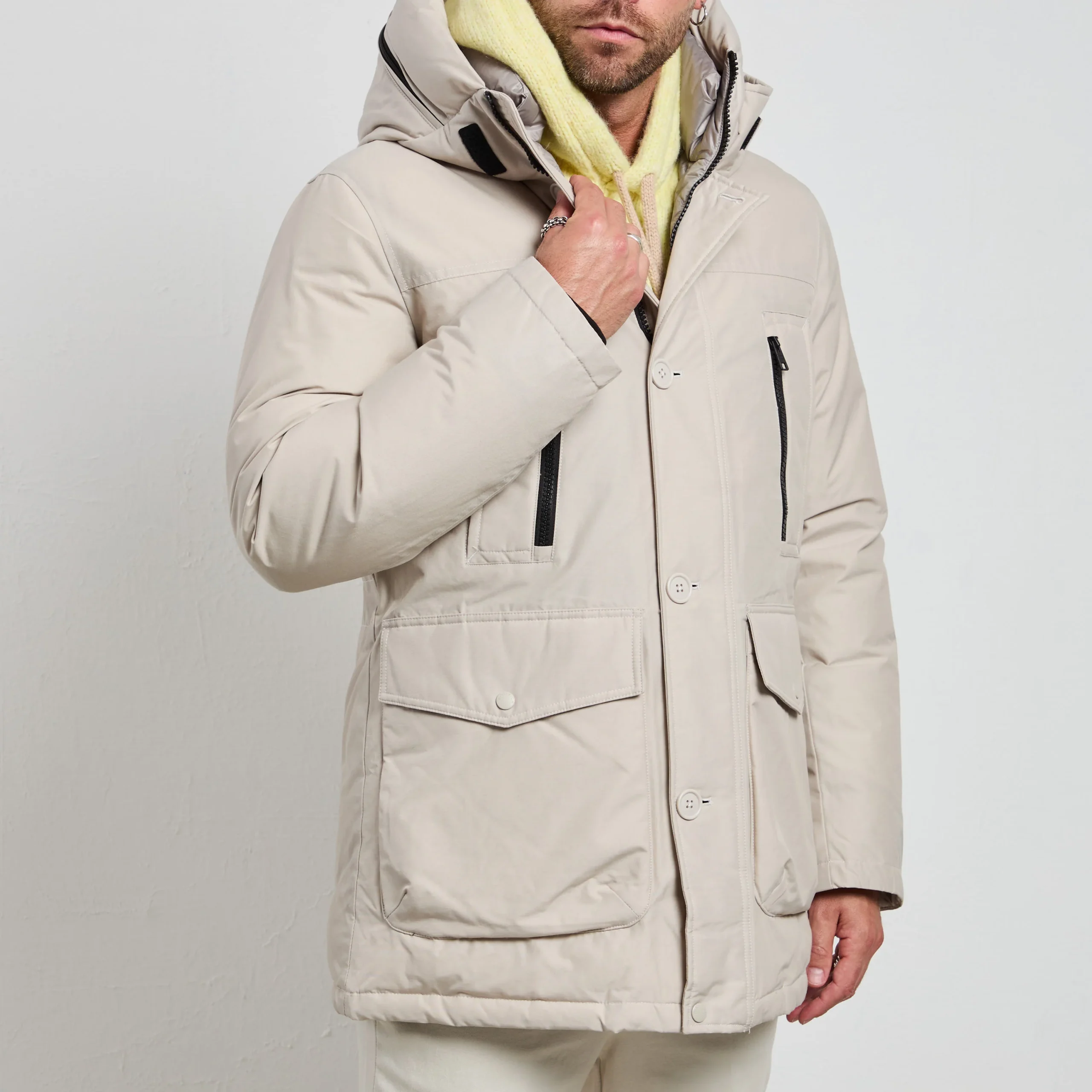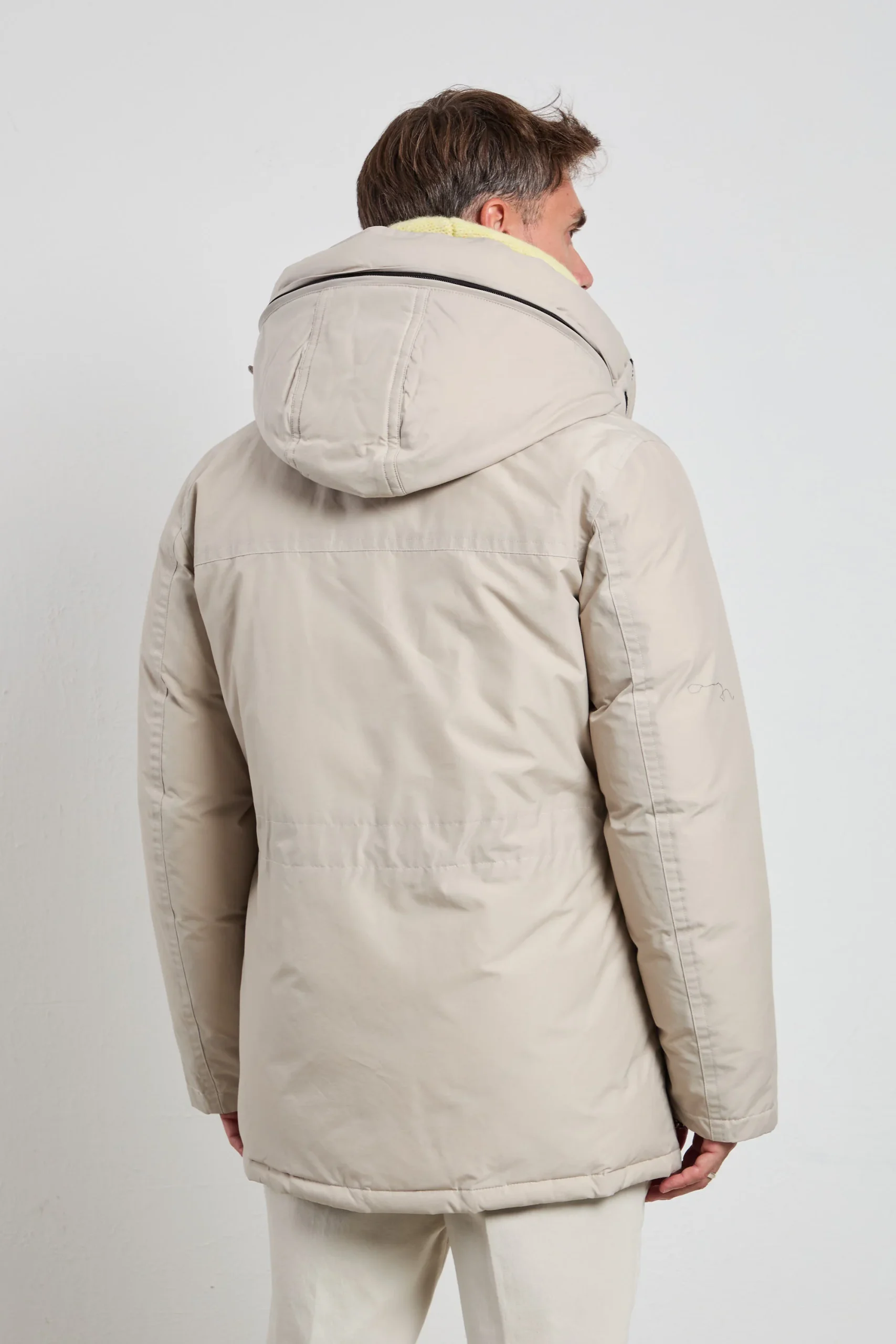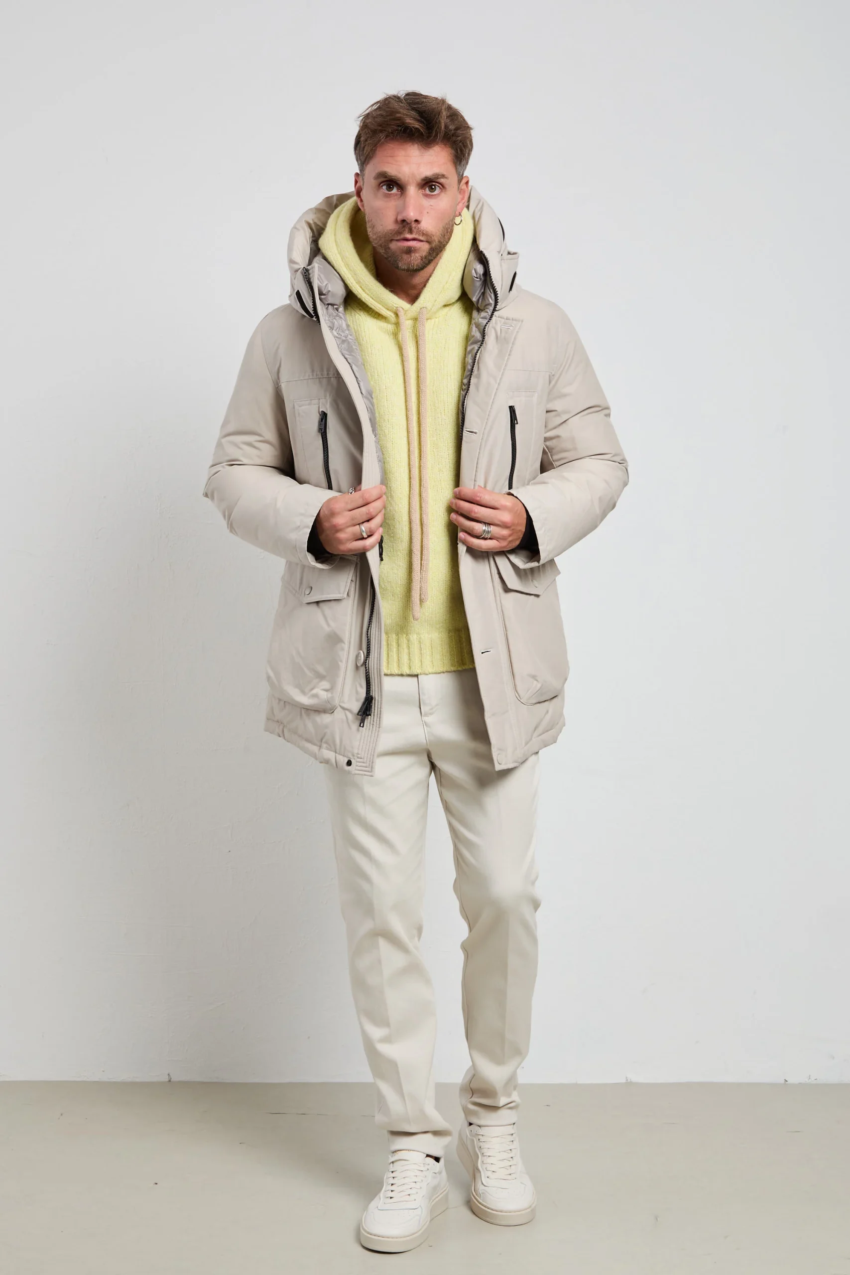 Perfetto per il colore ghiaccio, questo parka si abbina armoniosamente a pantaloni in lana chiara e stivaletti beige per un look urbano luminoso, a jeans chiari e sneakers pastello per un outfit casual contemporaneo, o a pantaloni tecnici e scarponcini neutri per un’eleganza funzionale durante le attività outdoor.