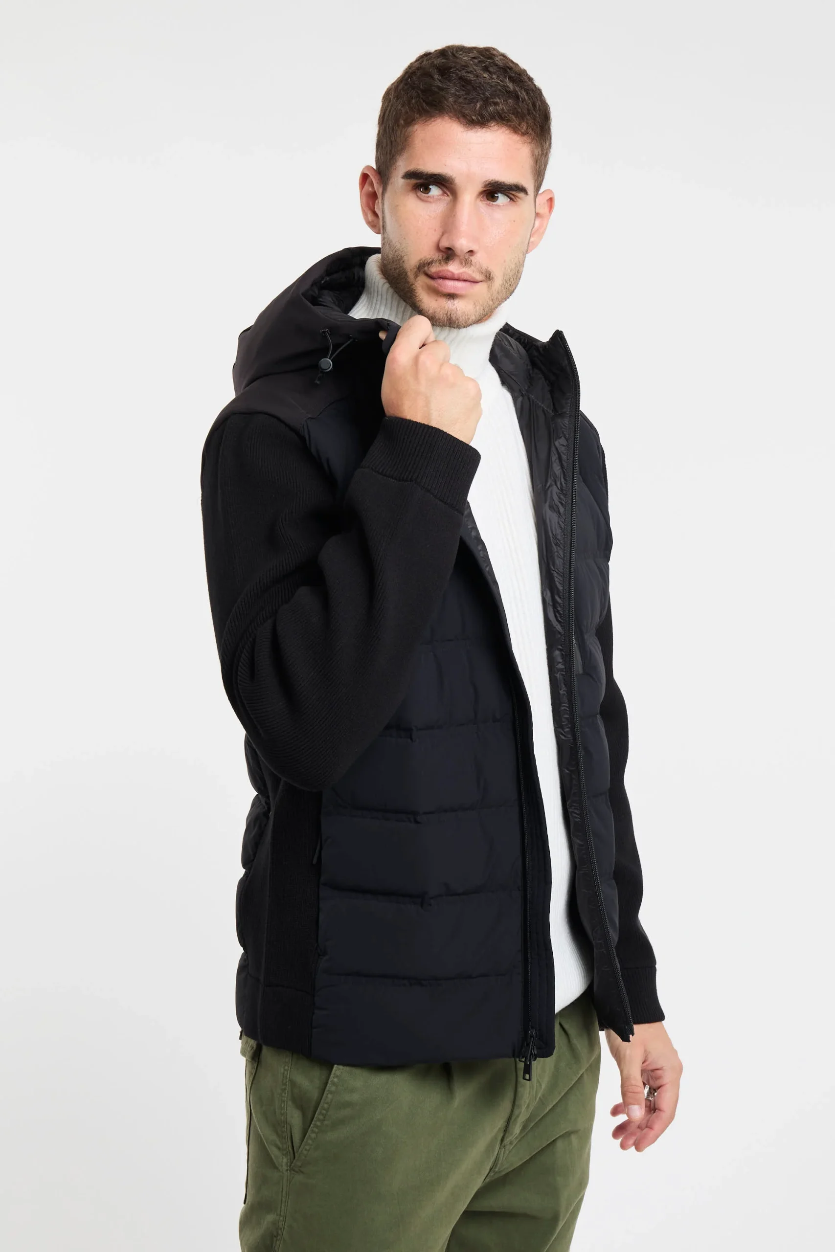 Un modello perfetto per la stagione fredda, pratico e avvolgente. Realizzato in nylon elasticizzato, questa giacca ibrida Bering è resistente all’acqua e al vento ed è imbottita in piuma d’anatra. È caratterizzata da una finitura opaca e una trapuntatura orizzontale. Il cappuccio regolabile e la linea delle spalle sono in tessuto Softshell impermeabile, mentre le maniche e i fianchi a coste in misto viscosa. Ha il collo alto, la chiusura con zip bidirezionale e i fianchi a coste. La tasca sul petto, le due laterali e quella interna, tutte dotate di zip, rendono il capo un esempio perfetto di funzionalità .